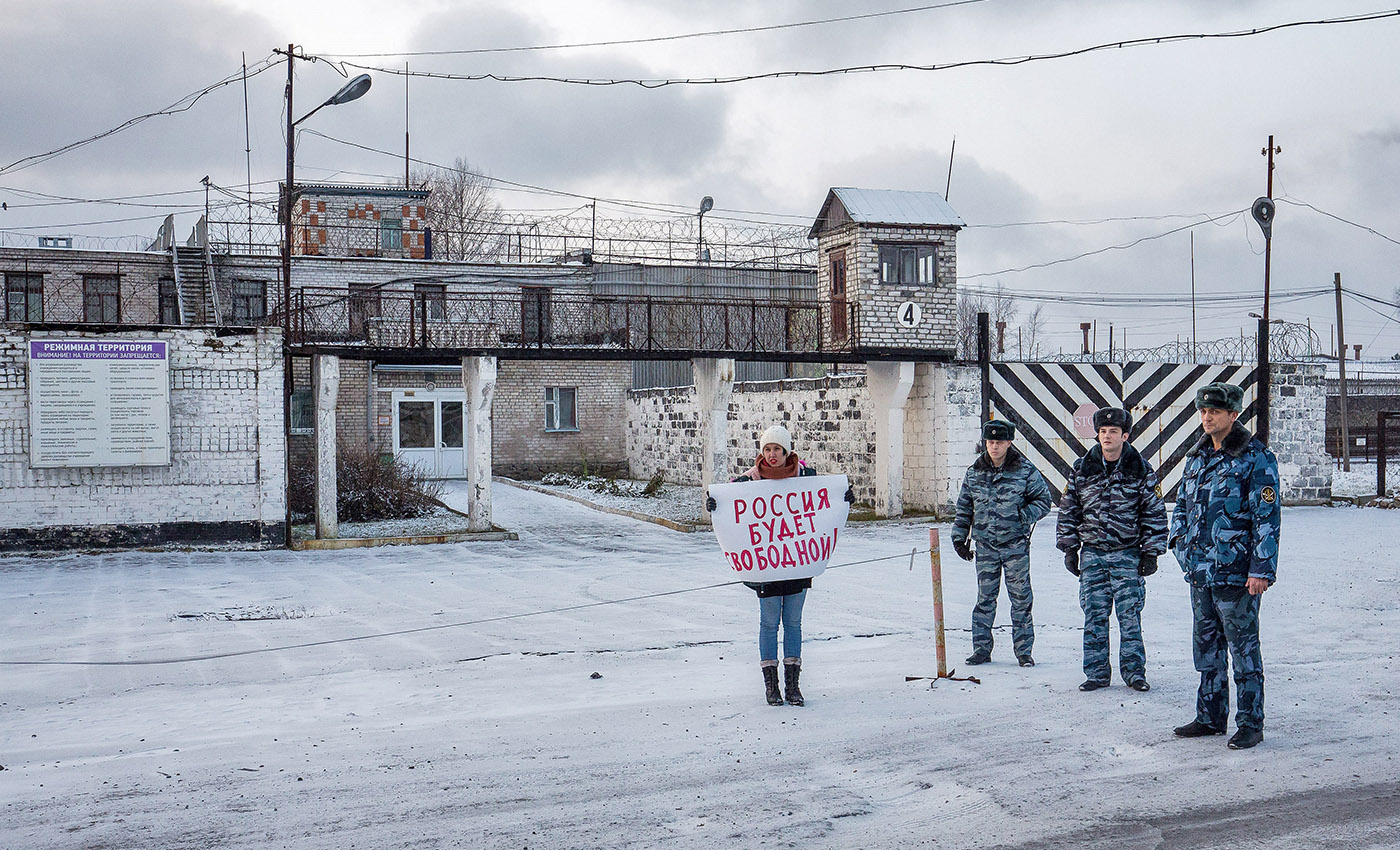 Сотрудники колонии и активист с плакатом «Россия будет свободной» у стен ИК-7 в Карелии, 4 ноября 2016 года. Фото: Давид Френкель / Коммерсант