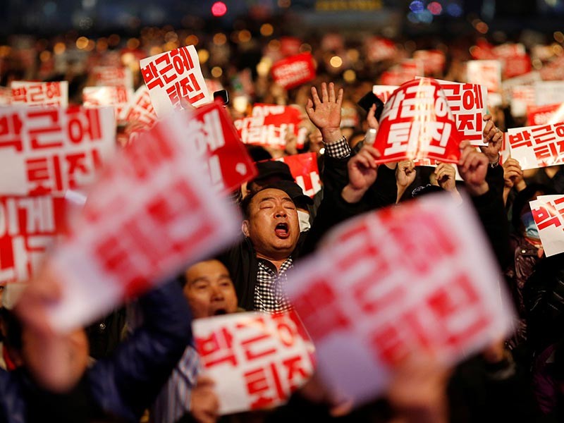 Десятки тысяч корейцев потребовали отставки президента Пак Кын Хе на демонстрации в Сеуле. Она приносила извинения из-за скандала с ее подругой и даже согласилась на допрос, но это не изменило настроя протестующих. На фоне скандала уровень поддержки населением Пак Кын Хе обновил рекорд падения и рухнул до минимальной отметки в 5%.