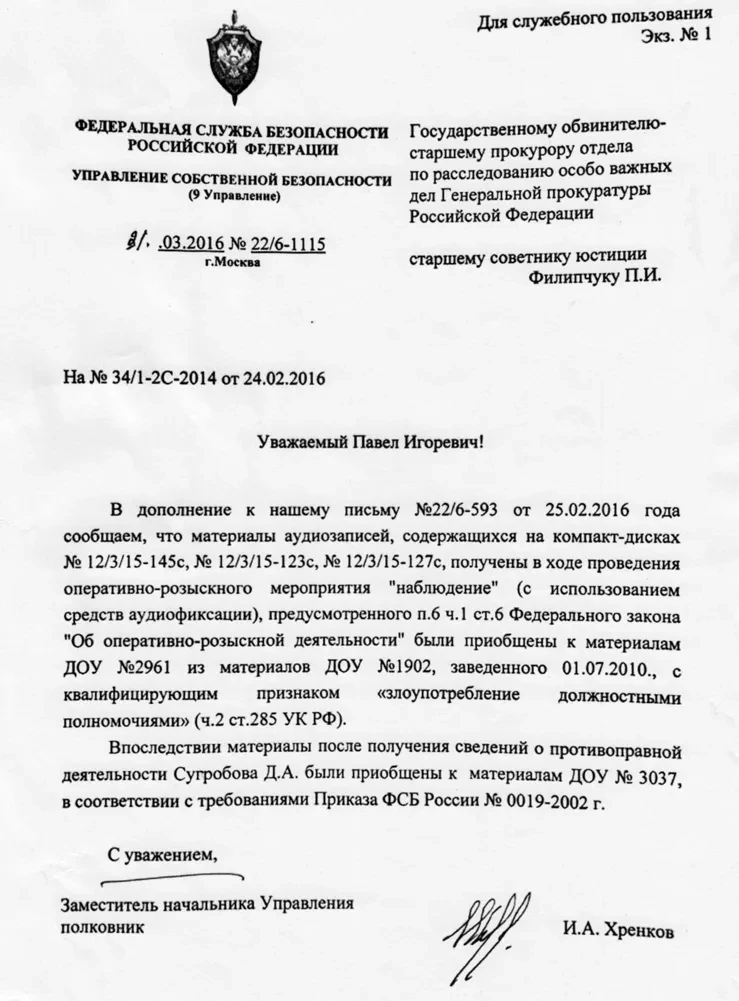 «С тех пор между мной и сотрудниками 6-й службы УСБ ФСБ по инициативе последних общение прекратилось. Они посчитали меня амбициозным руководителем, который не захотел выстраивать с ними отношения должным образом по выполнению их неформальных указаний», — говорит Сугробов, отмечая, что до поступившего «предложения» он находился в добрых отношениях с Олегом Феоктистовым и даже знакомил его с будущим министром внутренних дел Владимиром Колокольцевым.