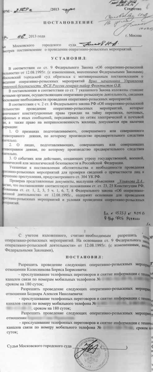 Теперь Денис Сугробов предполагает, что Глоба изначально мог войти в контакт с агентом Сергеем Пирожковым под прикрытием ФСБ. Надо заметить, что эта версия не лишена оснований: за несколько месяцев до начала этой разработки в июне 2013 года на основании постановления заместителя начальника УСБ ФСБ Мосгорсуд санкционировал прослушку телефонов Колесникова и Боднара. Само же постановление было вынесено на основании дела оперативного учета с квалифицирующим признаком «провокация взятки» — уже тогда руководство УСБ ФСБ, похоже, начало проверку ГУЭБиПК МВД на предмет наличия в действиях полицейских этого состава преступления.