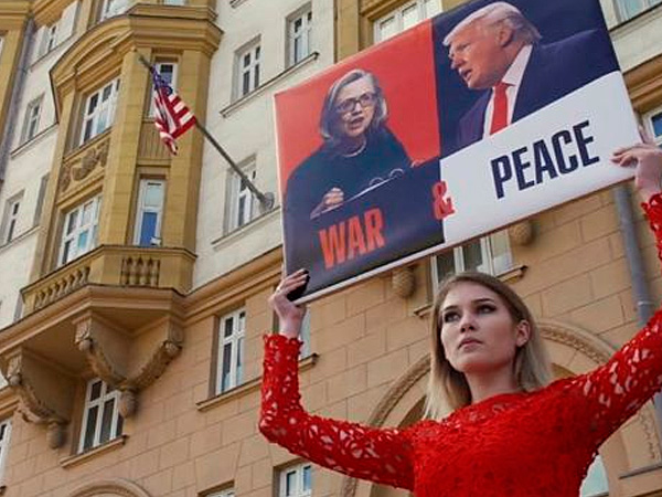 Активисты у посольства США в Москве. /bbc.com Политолог Евгений Минченко отмечает: «Разница. Хиллари на своих ралли выступает по 5-10 минут. Голос явно проседает. Потом включаются привлечённые звезды шоу-бизнеса. Трамп жжёт 25-30 минут. Звезды не нужны. Он сам звезда.