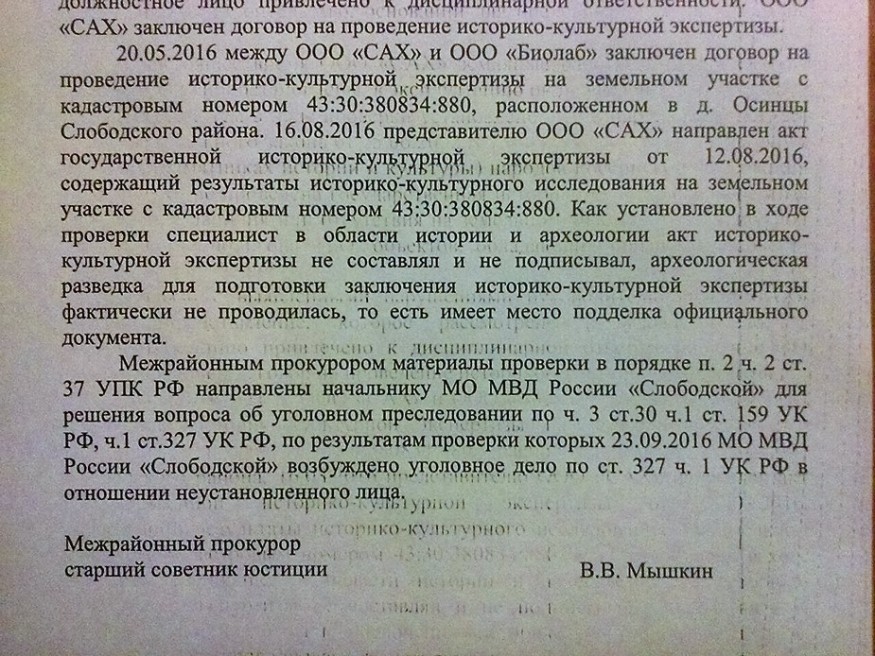 Слободская межрайонная прокуратура проводит расследование по статье 327 части 1 Уголовного кодекса РФ («Подделка удостоверения или иного официального документа, представляющего права или освобождающего от обязанностей») из-за фальсификации акта историко-культурной экспертизы территории, где было начато строительство полигона твердых бытовых отходов вблизи деревни Осинцы. Информация об этом появилась вечером 7 ноября.