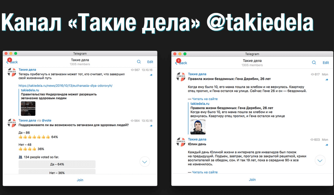 Используйте опросы, делайте эмоциональной подачу контента, даже если вы пишете о трудных жизненных историях. Слайд с примерами постов канала «Такие дела». Фрагмент презентации Елизаветы Кисловой.