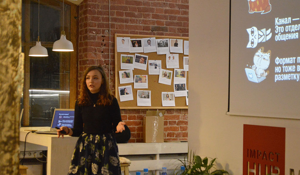 На встрече выступила Елизавета Кислова, менеджер по работе с клиентами проекта Combot.org и канала «Telegram-маркетинг».