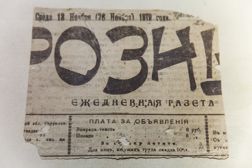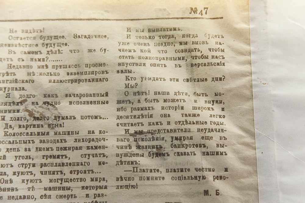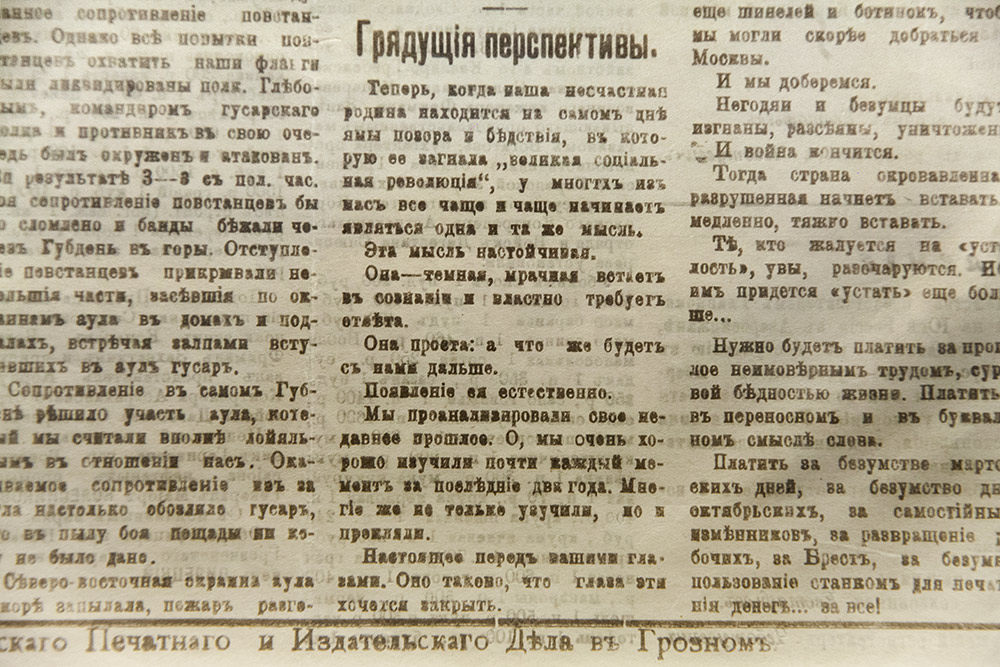 Перед вами единственный сохранившийся экземпляр выпуска белогвардейской газеты «Грозный» за 1919 год, в которой вышла первая публикация Булгакова, текст под названием «Грядущие перспективы», — как вы видите, орфография тут еще старорежимная. Подпись «М.Б.». История любопытна по нескольким причинам: это не только начало писательской судьбы Булгакова, но и дело еще и происходит на белом юге России, где Булгаков оказался не по своей воле, — его забрали туда в качестве военного врача (он описал события того времени в нескольких ранних произведениях, например, в «Необыкновенных приключениях доктора»).