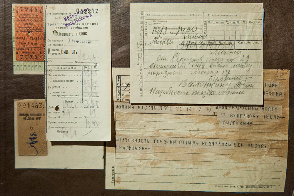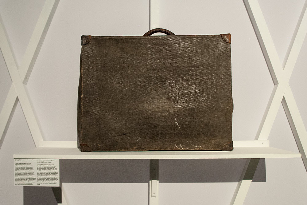 Перед вами чемодан Любови Евгеньевны Белозерской — яркой, интересной женщины,— второй жены Булгакова. Еще она была прототипом Серафимы из пьесы «Бег», потому что Белозерская познакомилась с Булгаковым уже после возвращения из эмиграции. Она уехала с прежним мужем в самом начале двадцатых и проехала тем же самым маршрутом, что и Серафима, то есть через Константинополь, Париж, Берлин. Этот чемодан путешествовал вместе с ней. Любовь Евгеньевна прожила довольно долгую жизнь — до второй половины восьмидесятых — и застала советскую экранизацию «Бега», первые театральные постановки, уже послевоенные, этой пьесы. В конце восьмидесятых в интервью, которое она дала для фильма Константина Симонова, но которое так и не вошло в фильм, она говорила довольно просто: «Серафима — это я». Ну и рассказывала, как описывала Булгакову Константинополь, Париж. Булгаков никогда не выезжал за пределы страны, он неоднократно просил выпустить его и в 1930 году, когда все его пьесы были запрещены, обратился с письмом к советскому правительству, попросил: «Если мне не дано работать в своей стране, то дайте мне работать где-нибудь еще и выпустите меня». Его не выпустили тогда, не выпустили и потом, когда он уже работал в МХАТе и просил пустить его во Францию, чтобы работать над постановкой «Мольера». Поэтому рассказы Любови Евгеньевны о загранице — это все, на что он мог рассчитывать.