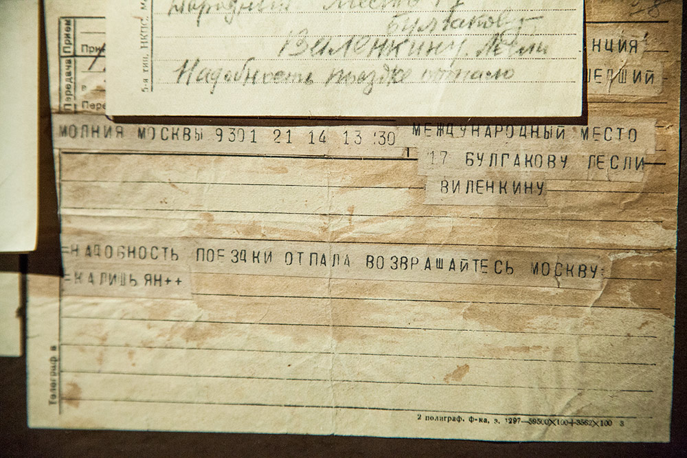 Булгакова, у которого в мае прошел обыск, конвоируют на Лубянку. На витрине мы видим подлинник показаний Булгакова, данных на допросе. Невероятно сильный документ, начинается он со слов «на крестьянские темы я писать не могу, потому что деревню не люблю», а продолжается тем, что «быт рабочих представляю хотя и гораздо лучше, нежели крестьянский, но все-таки знаю не очень хорошо. Да и интересуюсь им мало, и вот по какой причине: я занят, я остро интересуюсь бытом интеллигенции русской, люблю ее, считаю ее хоть и слабым, но очень важным слоем в стране». И дальше: «Я всегда пишу по чистой совести и так, как вижу. Отрицательные явления жизни в Советской стране привлекают мое пристальное внимание, потому что в них я инстинктивно вижу большую пищу для себя (я — сатирик)». Это своего рода манифест Булгакова, который он совершенно неслучайным образом сочинил на Лубянке. Поставив на главной сцене Москвы спектакль, главными героями которого были белые офицеры, Булгаков рисковал еще сильнее, чем раньше.