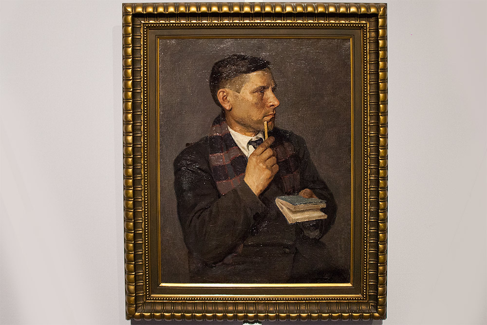 Это портрет Булгакова кисти Николая Радлова. Вообще портреты Булгакова — редкий жанр, прижизненных известно совсем немного. Особенно мало портретов «холст, масло». Радлов был невероятно интересным и образованным человеком, с ним Булгаков подружился, по всей видимости, после того как Радлов проиллюстрировал маленькую книжку, которая выходила у Булгакова, по-моему, в издательстве «Смехач» — приложением к журналу. Во-первых, это редкий прижизненный масляный портрет Булгакова, во-вторых, удачный, писательский, сделанный по законам жанра портретов писателей. Кроме того, он выставляется музейно впервые, и это важно, — он из частного собрания. Любопытно, что с портретом связан один документ — письмо Булгакова Замятину. Два замечательных писателя переписывались, и Булгаков пишет, в частности: «Не то у вас, не то у Николая Эрнестовича на вешалке забыл свой шарф — двухцветный, лиловый с черным. Пришлите мне его». Видимо, все-таки у Николая Эрнестовича он его забыл, потому что точно был там именно в этом двухцветном шарфе, — характерный пример того, как по дням, неделям и месяцам мы пытались на этой выставке восстановить биографию Булгакова.