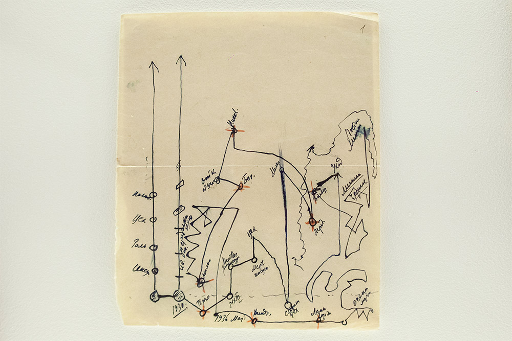Очень характерная вещь — рисунок Булгакова, который изображает ход его творческой жизни. Расшифровать его без каких-то дополнительных знаний довольно трудно, потому что там все сплошь сокращения, даты и так далее, но возможно. Это, конечно, только часть жизни с 1930 по 1937 год, сделан он, по всей видимости, в 1937 году. Почему такие хронологические рамки? Потому что в 1930 году он официально поступил, после разговора со Сталиным, на работу во МХАТ, а в 1936 году, после организованной травли Булгакова и его спектаклей, из МХАТа ушел. Эти самые шесть с небольшим лет и есть его работа в театре, которая продолжится в 1937-м работой в Большом театре, куда он перешел. Любопытно, что здесь много обозначений и дат, но самая верхняя точка, пик всей линии картинки, — это «Пиквикский клуб», это момент выхода Булгакова на сцену в качестве актера. Для Булгакова невероятно важны были не только авторство пьес и постановка спектаклей — выход на сцену стал для него огромным, важнейшим событием. В мае 1930-го его взяли во МХАТ режиссером, потом в июне он попросился и в актерский состав. На одном из первых показов, когда Булгаков вышел на сцену в роли президента суда в «Пиквикском клубе», присутствовал Станиславский. И Константин Сергеевич, которого окружали его коллеги и почитатели, спросил: «А кто это президента суда играет?» Ему говорят: «Булгаков!» А он: «Какой Булгаков!?» — «Наш, наш Булгаков!»