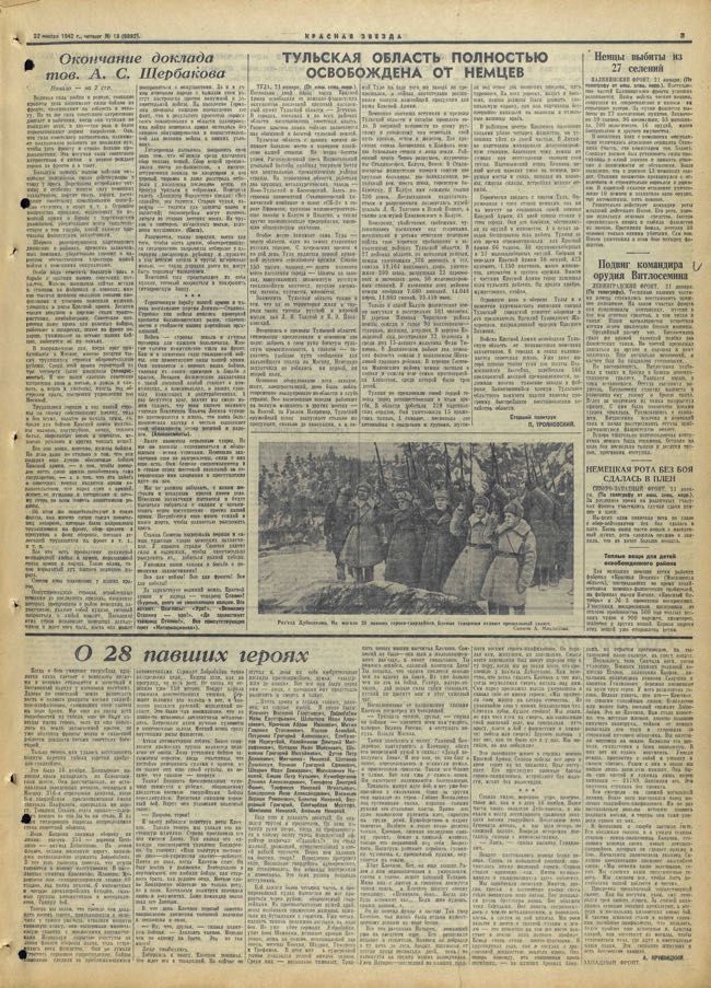 Когда место боя освободили от немцев, Кривицкий, по заданию Ортенберга, отправился выяснить подробности подвига в полк. На месте боя нашли три тела. Назвать фамилии погибших Капров не смог, Кривицкий получил список от командира 4-й роты Гундиловича, но откуда тот их взял — неизвестно. 22 января 1942 года в «Красной звезде» вышел подробный очерк о подвиге, где впервые назывались фамилии 28 героев. Именно в этой статье появился политрук Клочков (в заметке говорилось, что «Диев» было прозвищем), который произнес легендарную фразу: «Тридцать танков, друзья… придется всем нам умереть, наверно. Велика Россия, а отступать некуда. Позади Москва».