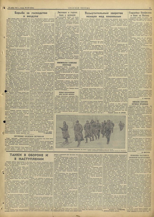 27 ноября в «Красной звезде» вышла небольшая заметка «Гвардейцы Панфилова в боях за Москву». В статье рассказывалось о героизме панфиловской дивизии — и в особенности о бое 5-й роты. Коротеев сообщал не только о ходе сражения, но даже передавал диалоги: