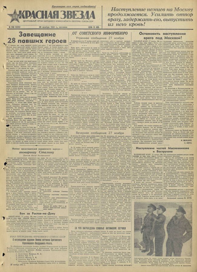 На следующий день, 28 ноября, о подвиге панфиловцев рассказывала уже передовица «Красной звезды», написанная литературным секретарем газеты Кривицким, который знал о бое исключительно со слов Ортенберга. Статья называлась «Завещание 28 павших героев». В тексте рассказывалось в том числе и о предателе, которого расстреляли свои за трусость. Позже Ортенберг пояснил, что о двух предателях решили не писать из соображений политической целесообразности.