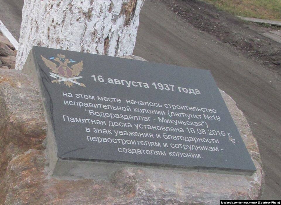 Об установке доски стало известно в конце октября. По словам местного правозащитника, это произошло 16 августа 2016 года в рамках празднования Дня колонии, которая находится на месте бывшего лесозаготовительного лагеря "Водоразделлаг – Микуньская". На плите было написано, что она установлена "в знак уважения и благодарности первостроителям и сотрудникам-создателям колонии".