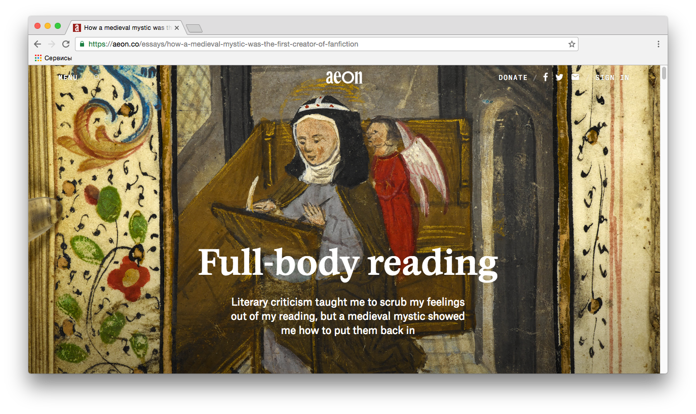 9. На сайте Aeon — эссе историка Анны Уилсон, посвященное средневековой духовной писательнице Марджери Кемп, которую считают автором первой автобиографии на английском языке. Уилсон, помимо истории, увлекается чтением и изучением фанфикшена: «Поглощая фанфики о Гарри Поттере, я занималась классической и средневековой литературой сначала в школе, затем в университете. Я выучила латынь и стала читать Вергилия, Цицерона и блаженного Августина в оригинале. Я писала холодные, рассудительные эссе, но ночь напролет проводила за моим постыдным удовольствием, фанфикшеном, который, кажется, максимально далек от изучения литературы». Особенно Уилсон по душе слэш — то есть фанфики, изображающие гомосексуальные отношения между героями: «Когда я читаю слэш, я чувствую, что меня как читателя признают и любят». В общем, Уилсон удалось совместить две свои страсти, и вот теперь она доказывает, что «Книга Марджери Кемп» — это еще и первый фанфик. «Посмертно Кемп приписали самые разные психические расстройства — от послеродовой депрессии до шизофрении, из-за чего ее часто не рассматривают всерьез как мистика или теолога. <…> Но когда я впервые читала „Книгу Марджери Кэмп”, я была поражена тем, как это мне знакомо. Ее видения, хотя и сугубо религиозные, по форме и ощущению очень напоминают мои истории о Мэри Сью». Мэри Сью, если кто вдруг не знает, это жаргонное обобщенное имя идеальной героини, которую вводят в чужую вселенную авторы фанфиков (и, как правило, описывают в ней себя).