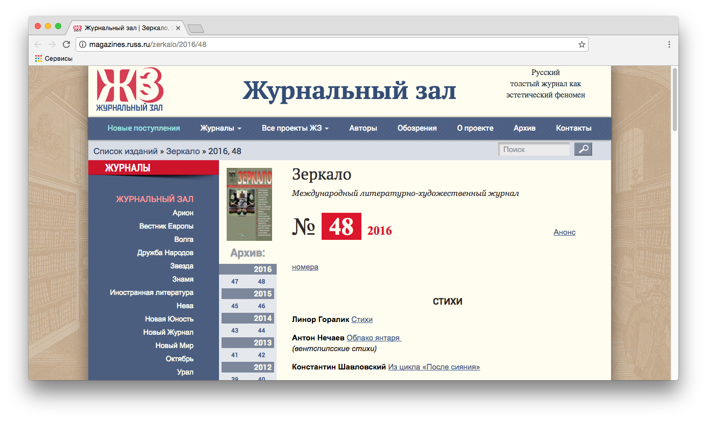 3. Вышел новый номер тель-авивского журнала «Зеркало». В нем стоит обратить внимание на новые стихи Александра Авербуха и Линор Горалик («Кого забрали из живых перед продленкой / бежит и крошечное яблочко кусает / летит в делирии под липами дер линден / летит пушинкой в распростертые объятья»), сверхнуарную прозу Ильи Данишевского, которую Дмитрий Бавильский сравнивает с «Песнями Мальдорора» (а нам хочется сравнить с Моник Виттиг, Жоржем Батаем и Майклом Джирой; чтение решительно не для всех), и важную архивную публикацию: абсурдистскую восточную притчу Павла Зальцмана. Здесь же — совсем уж неимоверные, офенско-петрушевские «Хандырские сказки» Леонида Сторча («Зарадовались тут стрыч да стрычья, засчастливились. Осенились по-страдазейскому, добровония воскурили, а потом растушили тушу вытрусля быстрехонько») и статья Татьяны Левиной о Пастернаке и русской живописи.