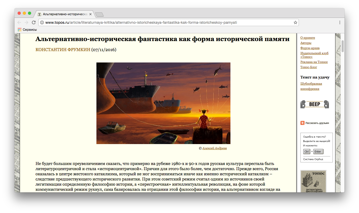 6. Журнал «Топос» публикует статью Константина Фрумкина «Альтернативно-историческая фантастика как форма исторической памяти». Название говорит само за себя: Фрумкин показывает, что фиксация фантастов на альтернативной истории, от «развилок» до «попаданцев», свидетельствует (как и многое другое) о том, что российская история не проговорена, относительно нее нет консенсуса, но запрос на такой консенсус — громаден. Эта непроговоренность во многом зависит от ощущения настоящего: «Поскольку мы не удовлетворены современностью, постольку естественно эта наша неудовлетворенность проецируется назад по шкале времени, превращаясь в желание внести исправления в предысторию». Постсоветская культура, по мнению автора статьи, из литературоцентричной превратилась в историоцентричную.
