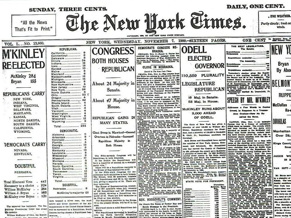 Первая полоса газеты "Нью-Йорк Таймс" с колонкой, посвященной результатам выборов. 7 ноября 1900 Wikimedia Commons / Public domain Кампания 1900 года была примечательна тем, что именно в ходе нее стал широко известен Теодор Рузвельт, агитировавший за республиканцев. Поэтому когда в 1901 году Мак-Кинли был убит (его смертельно ранил анархист Леон Чолгош), именно Рузвельт, занимавший пост вице-президента, стал президентом от демократов.