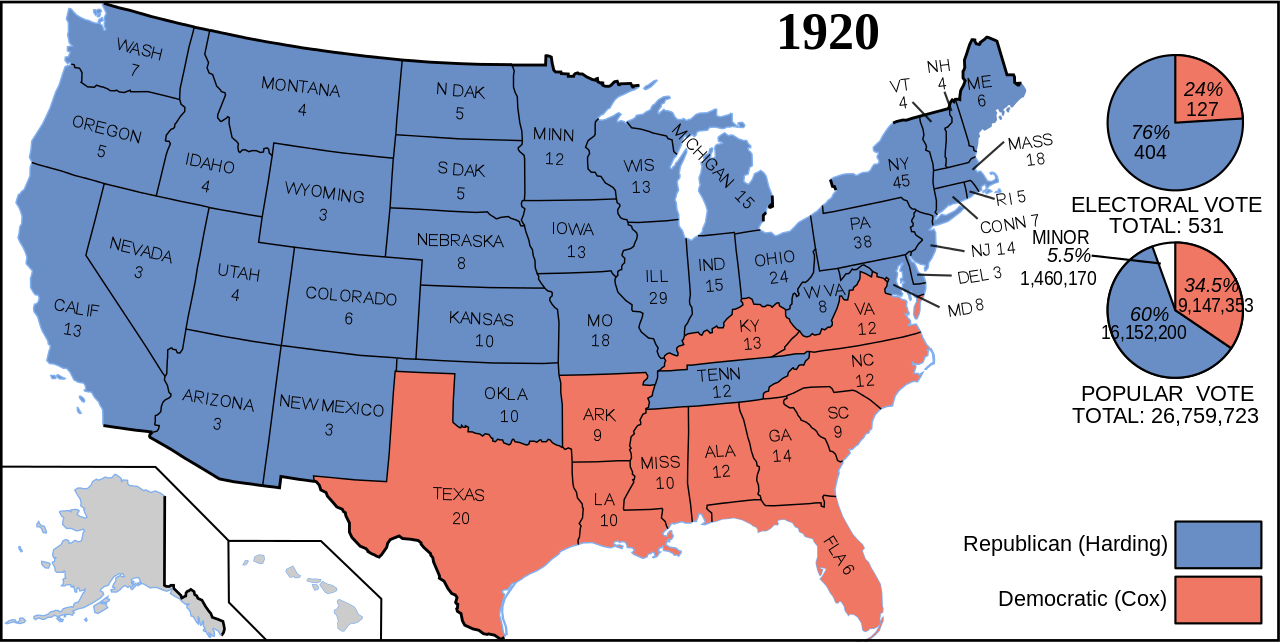 На выборах 1920 года победа досталась Уоррену Гардингу, представителю Республиканской партии. Он получил 16 144 093 голосов избирателей (60,3 %) и 404 голоса выборщиков. Его соперник от демократов Джеймс Кокс набрал 9 139 661 голосов избирателей (34,1 %) и получил 127 голосов выборщиков. К положительному результату для демократов можно отнести лишь то, что в ходе избирательной кампании стал широко известен претендовавший на кресло вице-президента при президенте Коксе Франклина Делано Рузвельт. Этого не произошло, так как Кокс потерпел поражение.