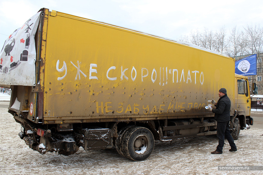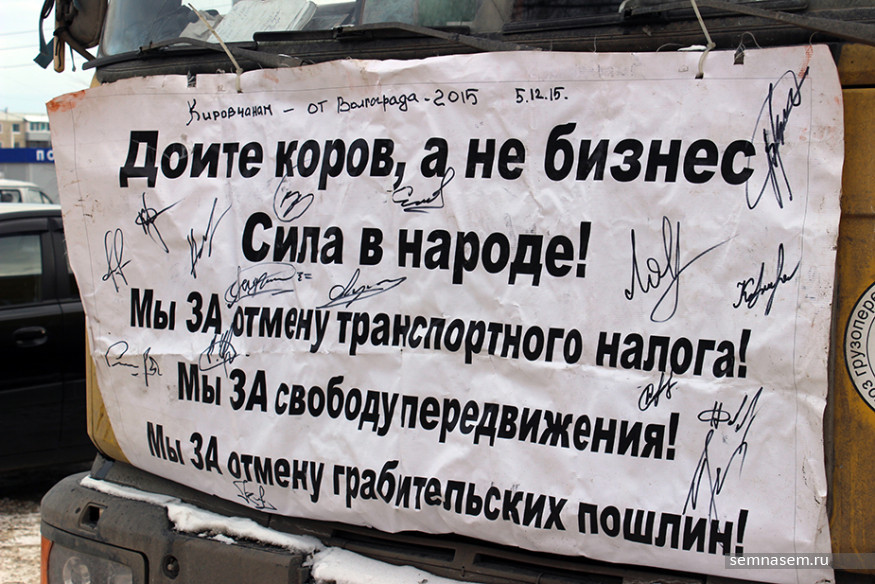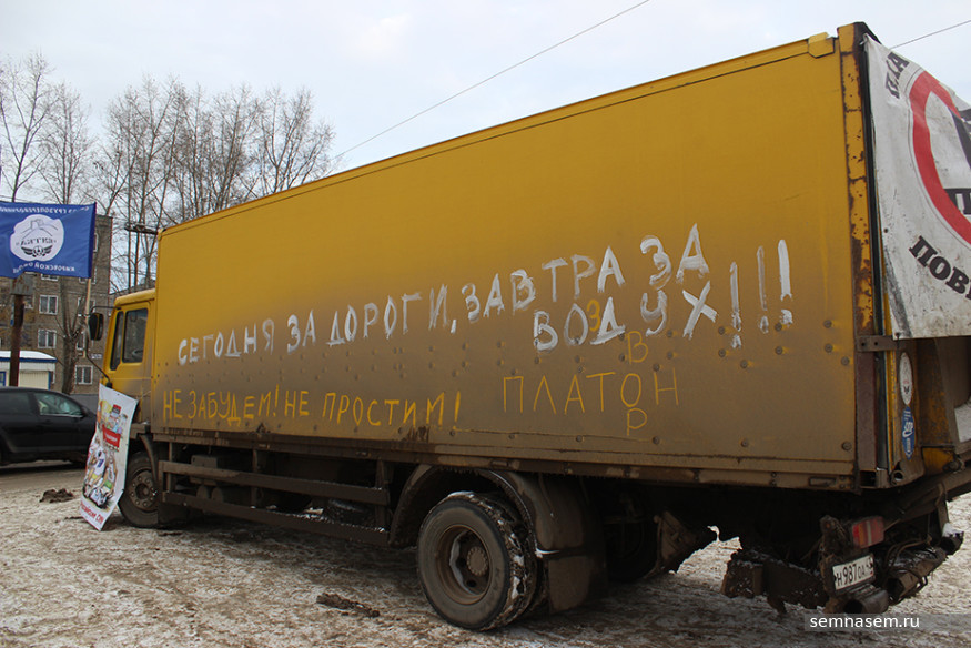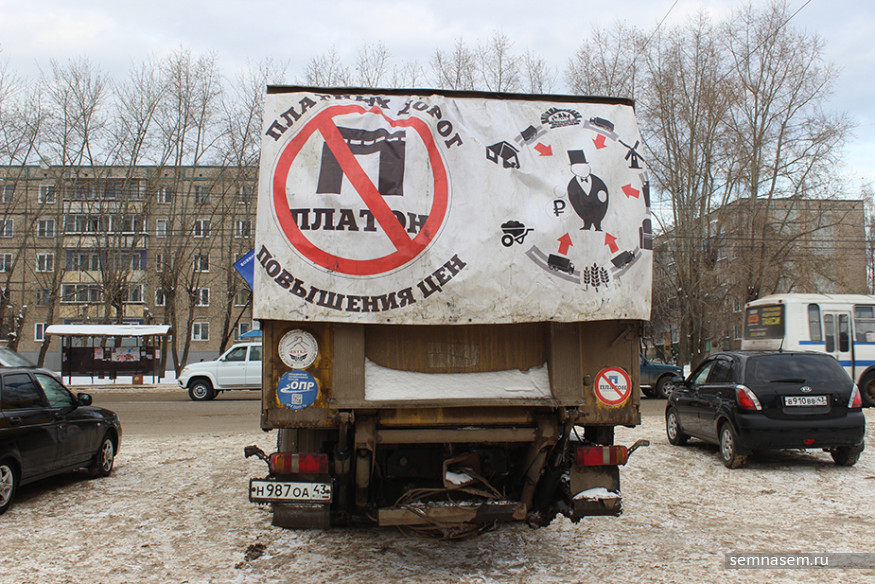 — Год назад мы начали протестовать против «Платона», вот сегодня отмечаем годовщину. Пробег был до этого. Он был достаточно массовый, ожидали, что меньше будет машин, но ребята взяли себя в руки, подключились, собрались. Мы за этот год добились того, что не подняли полный тариф, оставили 1,53 рубля, хотя они рассчитывали сделать 3,73. Самое главное, что мы сделали, — мы собрались в некоммерческую организацию «Союз грузоперевозчиков „Вятка“». Раньше мы варились каждый в своей каше, а теперь мы более сплоченные, облегчаем себе работу, получаем скидки от крупных магазинов, — объяснил Андрей, оторвавшись от покрасочных работ.
