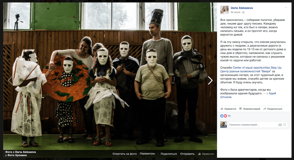Дарья Алексеева начала свой проект Charity Shop в 2014 году как благотворительный магазин в поддержку центра равных возможностей «Вверх». Теперь это организация, которая за год собирает сотни тонн ненужной одежды у москвичей, установила в городе десятки специальных контейнеров для сбора одежды. Charity Shop ежемесячно отправляет в регионы пять «Газелей», набитых бесплатной одеждой для нуждающихся. Проект находится на самофинансировании, в своих постах Алексеева во всех красках расписывает специфику работы малого бизнеса, а также порой приоткрывает завесу в мир благотворительности, показывая, как невысок уровень коммуникации среди небольших фондов.