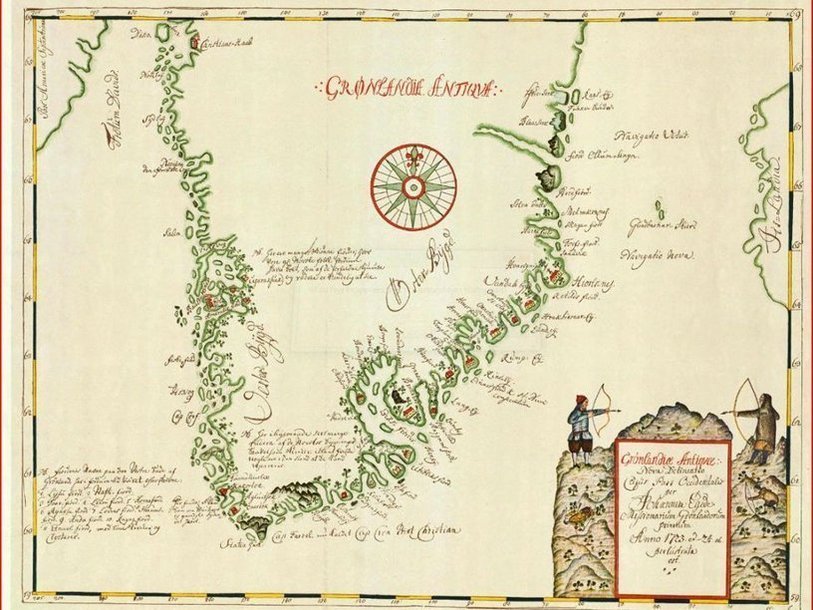 Карта Гренландии, выполненная Хансом Эгеде (1723) Wikimedia Commons В начале XVIII века лютеранский священник Ханс Эгеде, живший на Лофотенских островах на севере Норвегии, задумался над сказаниями о плаваниях древних викингов. Ему было известно, что в конце X века Эрик Торвальдсон, известный также как Эрик Рыжий, открыл «Зеленую землю» – Гренландию, а сын Эрика Лейф чуть позже добрался до Винланда (Ньюфаундленда), Маркланда (Лабрадора) и Хеллуланда (Баффиновой Земли). Долгое время поселения скандинавов за океаном существовали, но затем всякая связь с ними была утрачена и судьба их оставалась неизвестной.