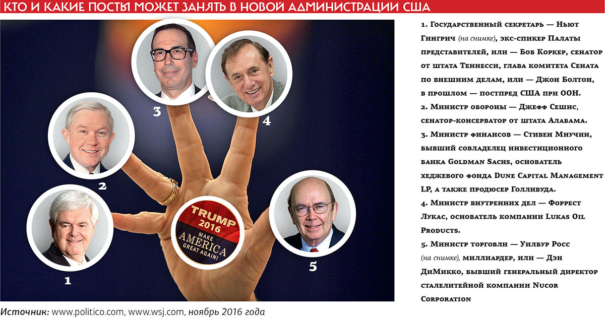 Впрочем, в администрацию могут войти и умеренные деятели, такие как бывший спикер Палаты представителей Ньют Гингрич и бывший советник президента Буша-младшего по национальной безопасности Стив Хэдли.