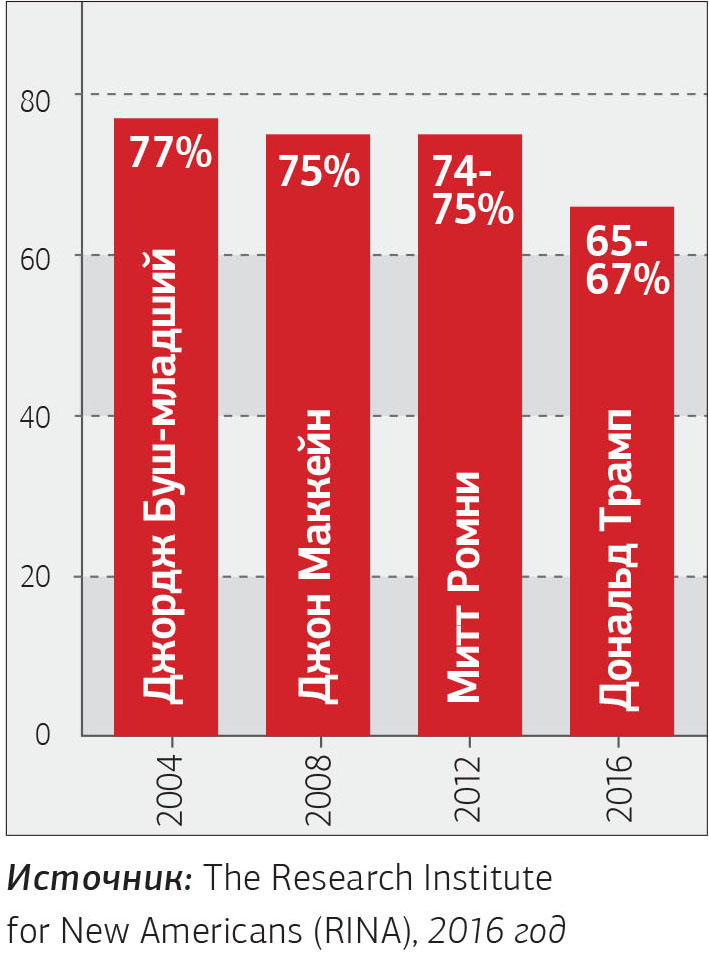 Сколько же весит голос «русской улицы»? Согласно официальным данным за 2009 год, в США числились около 3 млн русскоязычных или 1% населения (сейчас, по разным данным, их 4–5 млн. — NT). К «русским» в США относят и еврея, и узбека, и грузина — всех выходцев из бывшего СССР. Около 800 тыс. из них называли своим родным языком русский, однако многие не владели им вообще. Пестрая русская диаспора в массе традиционно голосует за республиканцев, которые во времена противостояния с СССР отличались более жесткой позицией по отношению к идеологическому антиподу. Большинство американских русскоязычных СМИ, сформированных под влиянием политической иммиграции из Союза, — печатных изданий, телеканалов и радиостанций — ориентированы на консервативные взгляды, причем откровенная пропаганда и навязывание политических клише по-прежнему считаются в иммигрантской тусовке хорошим тоном. По данным онлайн-ресурса USNews, специализирующегося на рейтингах, на выборах-2012 около 70% в районах компактного проживания, таких как Брайтон-Бич, отдали свои голоса за кандидата от Республиканской партии. Выходцы из СССР считают провальной политику демократической администрации по отношению к главному стратегическому союзнику США на Ближнем Востоке — Израилю. Они не хотят усиления вмешательства государства в экономику и перераспределение доходов — пусть и по модели европейских демократий. При этом брайтонские бабушки и дедушки наслаждаются вполне себе «развитым социализмом» в виде различных льгот, бесплатной медицины, субсидированного жилья и системы домов дневного посещения для пожилых, известных как «детсады».