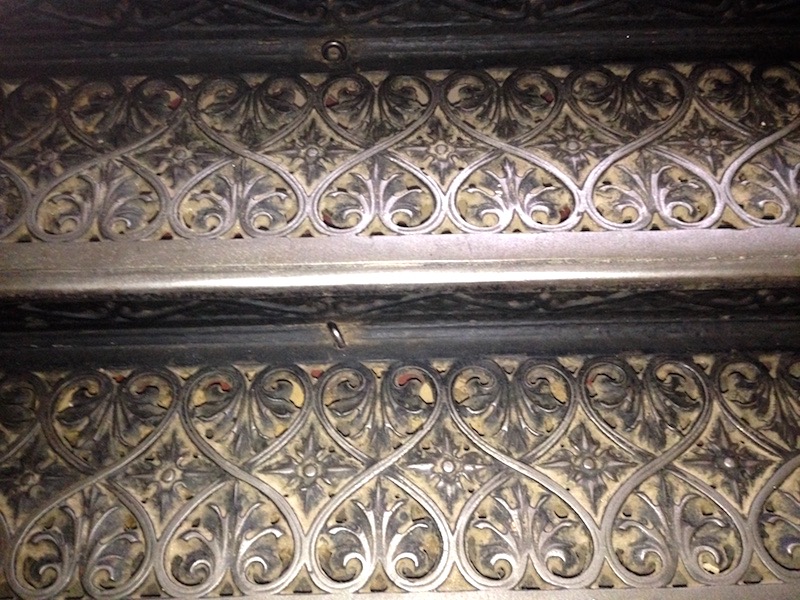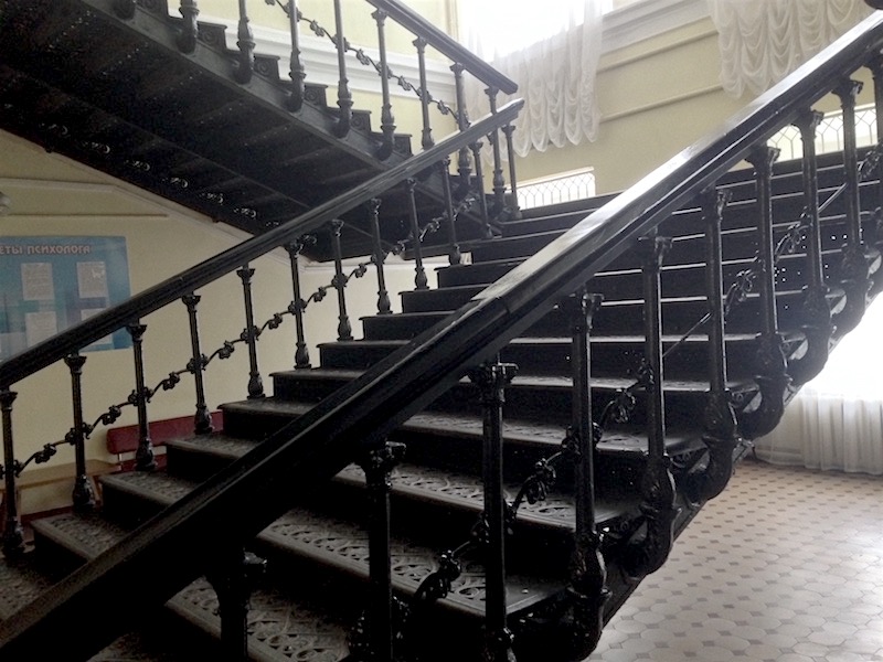 Выглядит странно, что Калужская область, славная привлечением инвесторов, не смогла привлечь инвестора сюда. Да, здесь не построишь коммерческую недвижимость, но этот овраг напрашивается стать главной городской рекреационной зоной. Даже делать ничего не надо - примените механизм концессии, и, уверен, сразу найдётся тот, кто проложит пешеходные и вело-дорожки, площадки для детей и спорта, скамейки, туалеты и урны за... обычное разрешение эксклюзивно торговать на этой территории. Такая земля в центре областной столицы - пустыня! Уму не постижимо! Мимо места, где стоял знаменитый пионер, делающий селфи (и, сдаётся мне, знаю я автора скульптуры, но не скажу))), мы вышли к Дому пионеров, естественно, и Даниил показал нам редкий кайф, который далеко не все гости могут увидеть. Недовольные бабушки-вахтёрши по просьбе Даниила разрешили нам сфотографировать необычный раритет: чугунную лестницу.