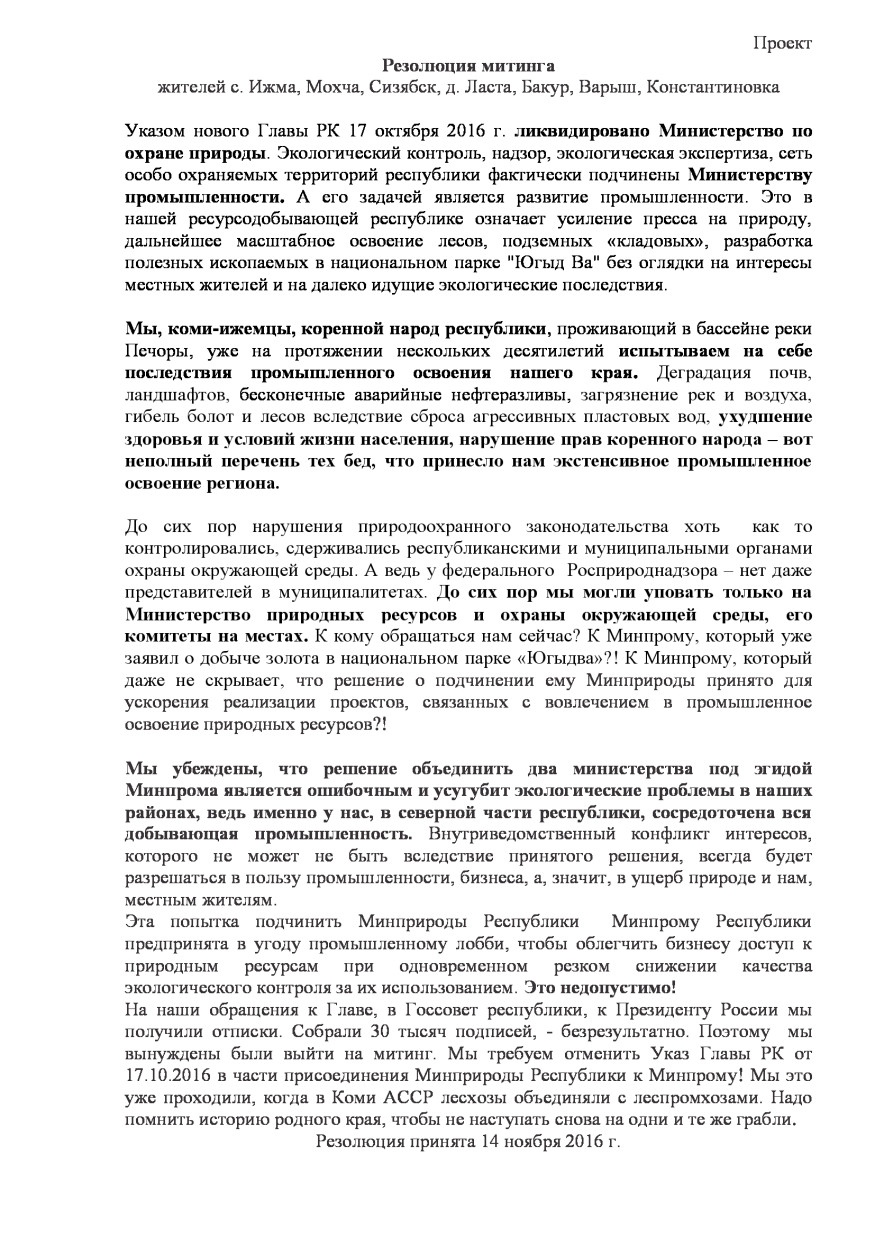 По итогам митинга собравшиеся приняли резолюцию, в которой призвали власти Коми пересмотреть решение о слиянии Минпрома и Минприроды Коми: