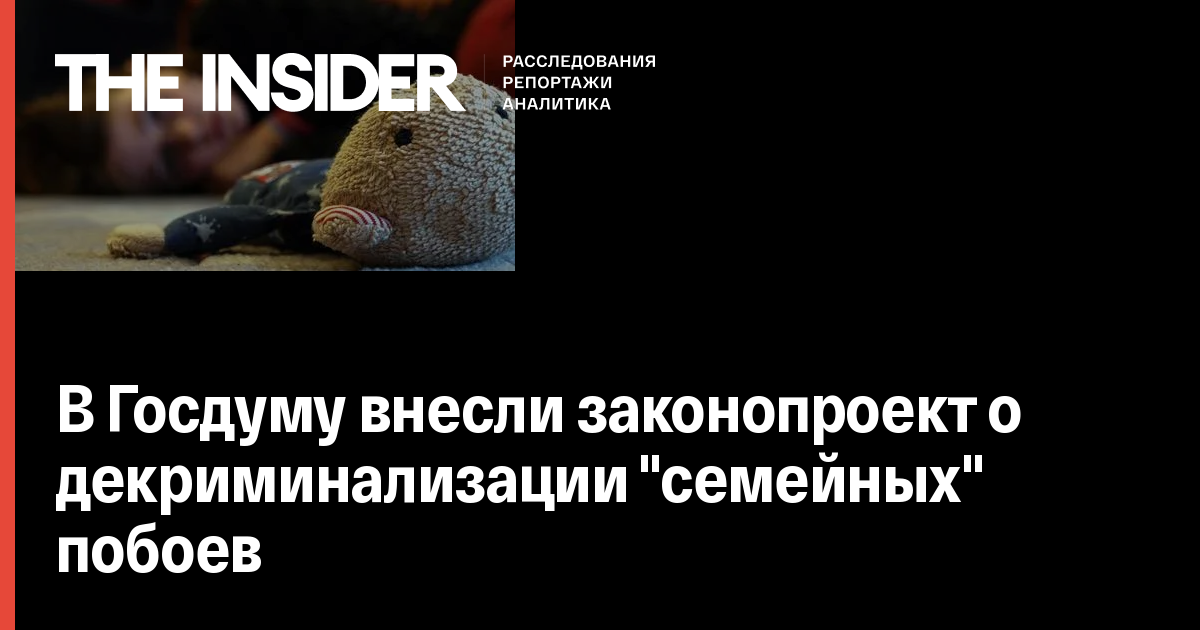 Группа депутатов Госдумы и членов Совета Федерации внесла на рассмотрение нижней палаты парламента России законопроект о декриминализации побоев в отношении близких родственников, пишет «Интерфакс».