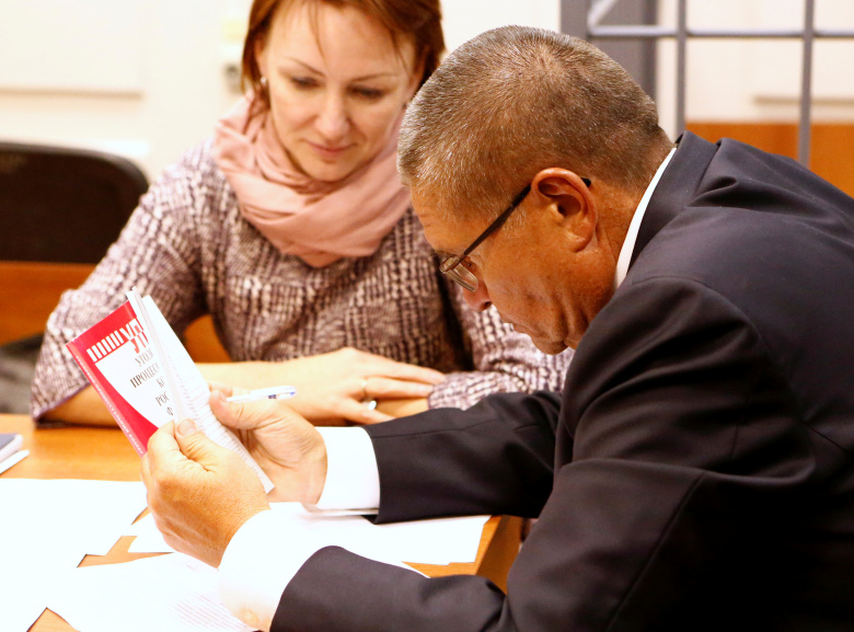 Russian Economy Minister Alexei Ulyukayev who was detained by law enforcement officials on corruption charges, attends a hearing at the Basmanny district court in Moscow, Russia, November 15, 2016. Алексей Улюкаев изучает Уголовный Кодекс РФ в Басманном суде. Фото: Sergei Karpukhin / Reuters