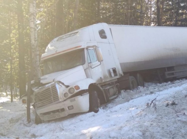 Красноярец на 22-тонном Freightliner вез фурнитуру для мебели в Улан-Удэ. На трассе Сергей не справился с управлением, и на скользкой дороге тягач занесло в кювет.