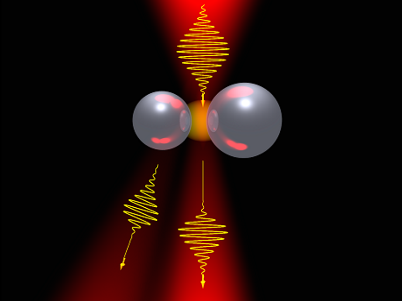 Для поворота диаграммы направленности наноантенны авторы воспользовались механизмом генерации плазмы в кремнии. Наноантенна представляет собой димер — две кремниевые наносферы различных диаметров. При облучении слабым лазерным пучком рассеяние света на такой антенне происходит в сторону вследствие несимметричной геометрии. Диаметры наночастиц выбраны так, что на длине волны лазера одна из них является резонансной. При облучении мощным лазерным импульсом в ней происходит интенсивная генерация электронной плазмы, что приводит к изменению оптических свойств этой частицы. Другая же частица – нерезонансная, и мощное поле лазера почти не влияет на ее свойства. Говоря грубо, при правильном выборе размеров двух частиц и параметров падающего пучка (длительности и интенсивности), размеры частиц становятся эффективно «одинаковыми», и антенна переизлучает свет вперед.