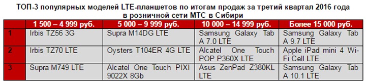 Самым востребованным брендом LTE-планшетов в рознице МТС в регионах Западной Сибири является Irbis, его продажи выросли в 3 тыс. раз за год. Модели Irbis вошли в топ-3 в категориях от 1500 до 4999 рублей, от 5000 до 9999 рублей. Что касается более дорогих сегментов, от 10 тыс. рублей, то там наиболее востребованы модели Samsung.
