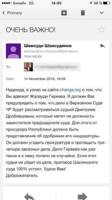 «Нас никто не уведомил о дате рассмотрения жалобы в суде, я узнала о начале заседания совершенно случайно, — рассказала «Новой» один из адвокатов Гериева Надежда Ермолаева. — Также накануне заседания по электронной почте я получила письмо от неизвестного человека, который утверждал, что председательствующим по делу будет судья Горбовцов (в письме в его фамилии опечатка), который метит на должность заместителя председателя суда, а значит, сделает все, чтобы оставить приговор обвинительным и не осложнять отношения с прокуратурой. Я не склонна доверять анонимным письмам. Но дело в том, что на тот момент состав суда официально еще не был оглашен, то есть, фамилию судьи, который будет рассматривать наше дело, мог знать только человек, вхожий в кулуары суда. Наведя некоторые справки, мы пришли к выводу, что в письме содержится правдивая информация, поэтому и заявили ходатайство об отводе».
