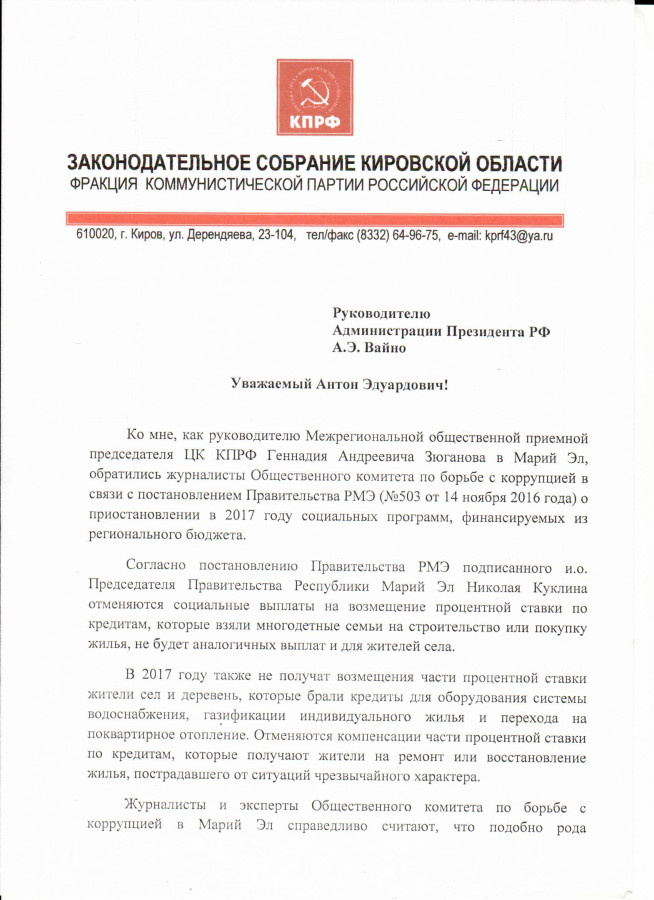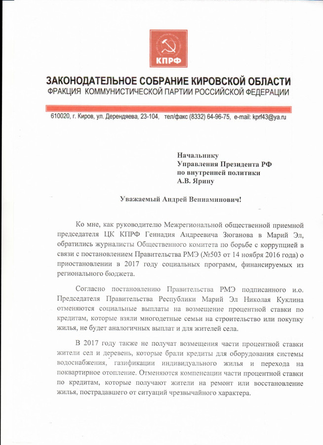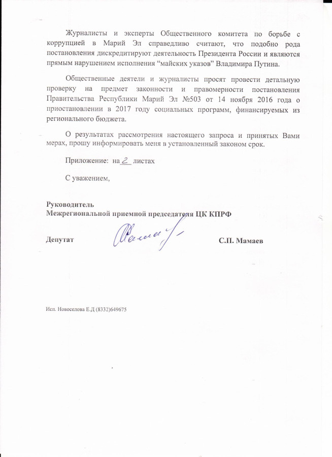 Руководитель межрегиональной приемной председателя ЦК КПРФ и депутат Сергей Мамаев направил запросы в Генпрокуратуру и администрацию Президента России в связи с незаконным отказом финансирования социальных программ Правительством Марий Эл