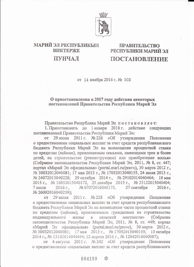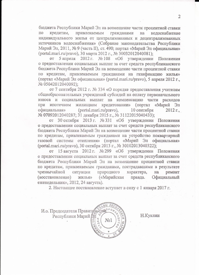 Согласно постановлению Правительства РМЭ подписанного и.о. Председателя Правительства Республики Марий Эл Николаем Куклиным отменяются социальные выплаты на возмещение процентной ставки по кредитам, которые взяли многодетные семьи на строительство или покупку жилья, не будет аналогичных выплат и для жителей села.