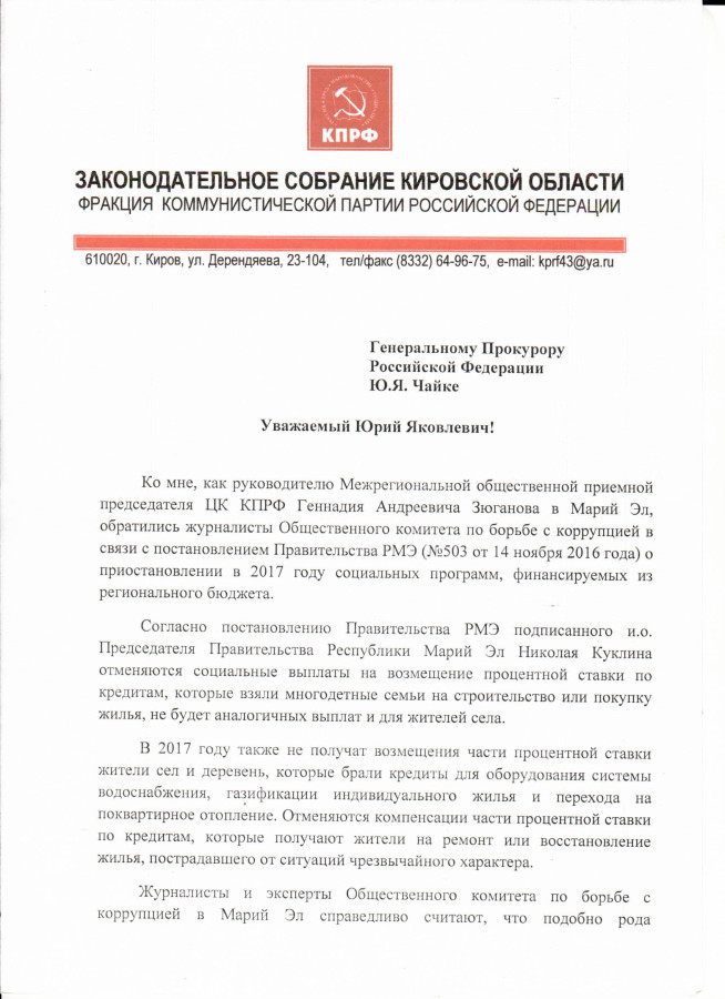 Журналисты и эксперты Общественного комитета по борьбе с коррупцией в Марий Эл обратились в межрегиональную приемную председателя ЦК КПРФ Геннадия Зюганова в связи с незаконным отказом правительства Республики Марий Эл финансировать социальные программы в регионе.