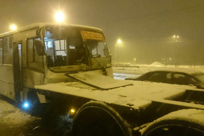 Утром 18 ноября водитель маршрутки врезался в сломавшийся грузовик, который стоял в двух метрах от проезжей части на Индустриальном проспекте в Петербурге.