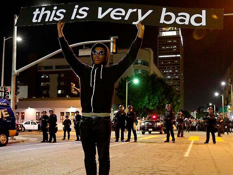 Участник акции против Д.Трампа / latimes.com Печально, заключает WSJ, что избранный президент проиграл на всеобщем голосовании. Однако еще печальнее было бы, если бы выиграла Клинтон на основании исключительно массовости, но без учета географического признака, который определяет равномерность распределения политических прав.