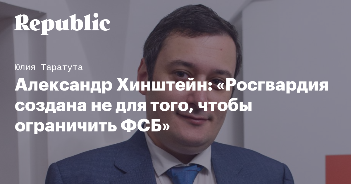 В конце октября бывший журналист и экс-депутат Государственной думы Александр Хинштейн получил должность советника директора Национальной гвардии России (Росгвардии) Виктора Золотова – как принято считать, человека, который пользуется особым доверием президента Владимира Путина. В интервью Republic Хинштейн рассказывает о том, зачем создавать еще одно силовое ведомство, можно ли считать отношения между силовиками войной, о новом шефе и о том, к чему приводит борьба с коррупцией в прямом эфире.