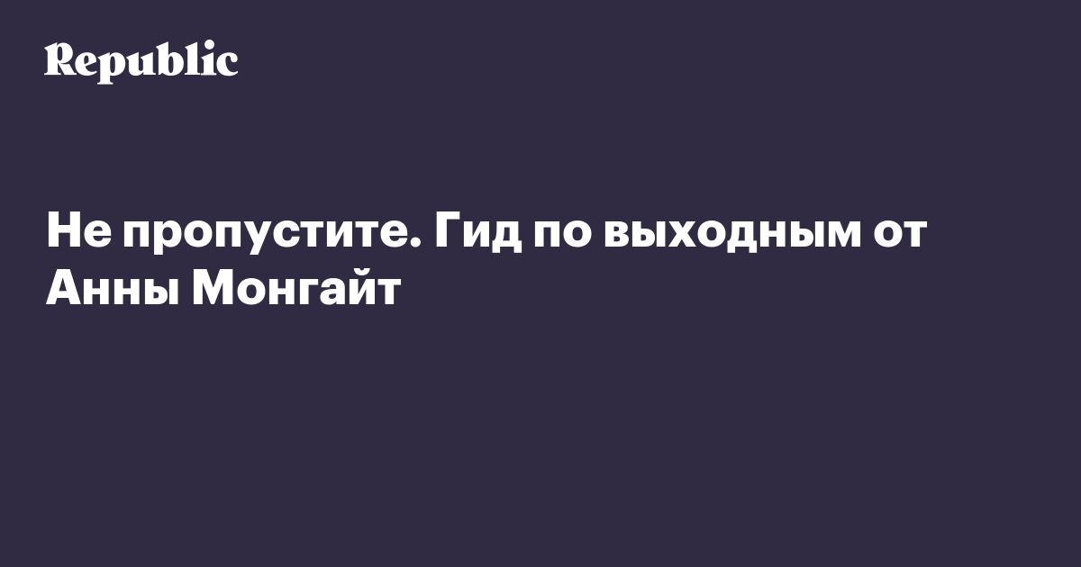 Каждую неделю Анна Монгайт отбирает для читателей Republic самые громкие и важные культурные события уикенда. Куда пойти, что посмотреть, как с умом провести свободное время в Москве и Санкт-Петербурге в режиме Weekly. Не пропустите.