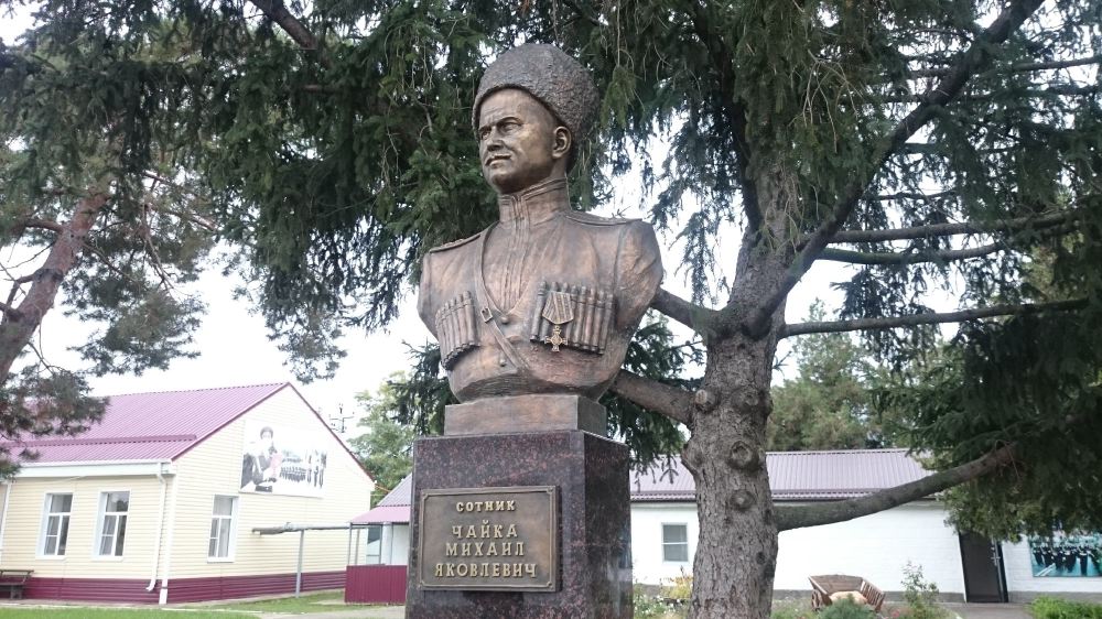 Памятник деду генпрокурора Юрия Чайки сотнику Михаилу Чайке на территории казачьего кадетского корпуса в станице БриньковскойФото: Зинаида Бурская — Земляк вам сильно помогает? — спрашиваю у крепкого хозяйственника.