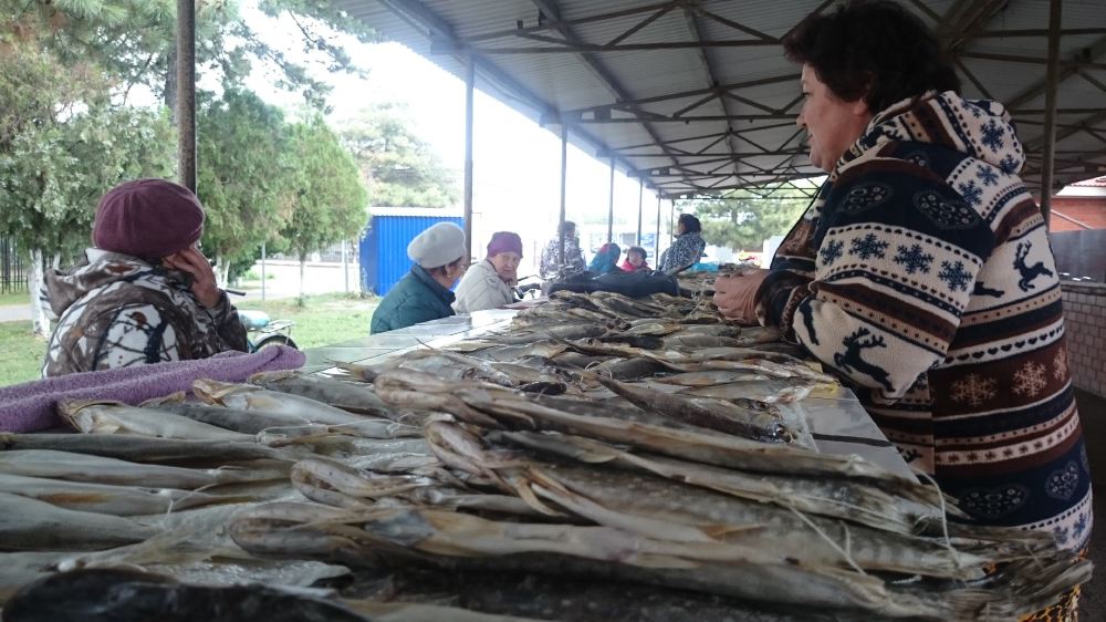 Торговка рыбой Лена заворачивает нам сазанов и говорит, что денег от продажи рыбы хватает ровно на то, чтобы заплатить за свет и за газ. Ее соседка по прилавку Оксана рассказывает, что муж работает в БНВХ, Бейсугском нерестово-вырастном хозяйстве. Прошлой зимой ему ощутимо задерживали зарплату, и сейчас опять началось. Жаловаться или судиться Оксана боится. Мол, сразу уволят и тогда в семье без работы будут оба. Такие порядки.