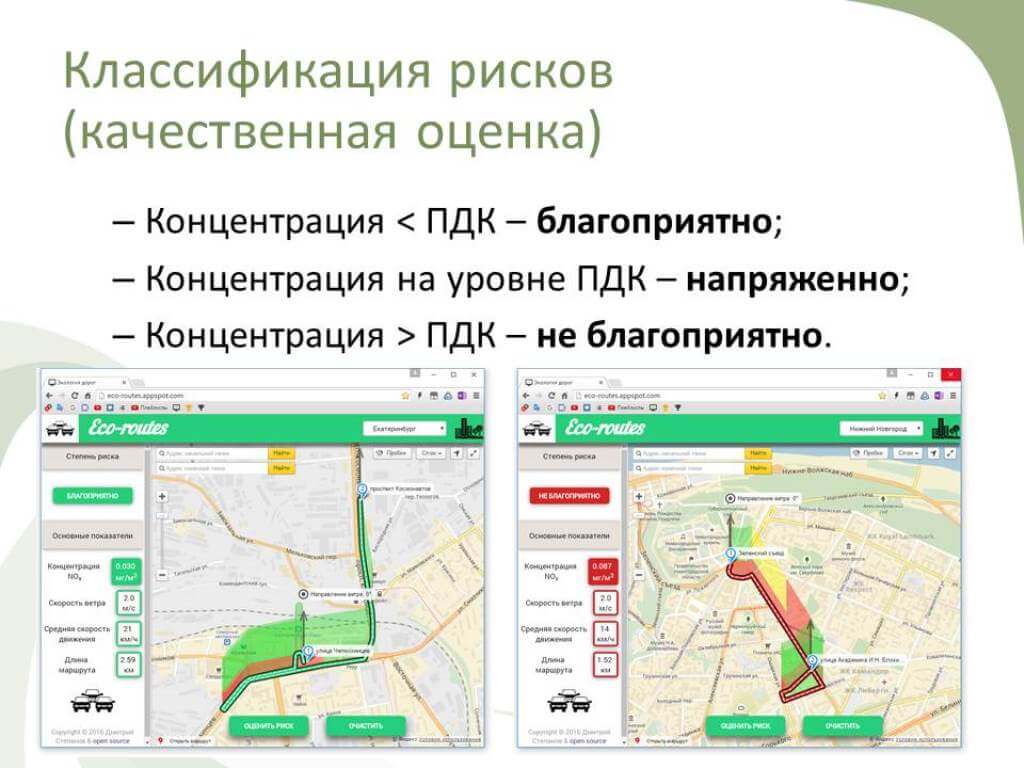 В 2016 году в Нижнем Новгороде был запущен сервис Eco-routes, который помогает в режиме реального времени определять загрязнение городской среды выбросами автотранспорта. С помощью сервиса можно проложить на карте предполагаемый маршрут поездки и оценить риски для своего здоровья.