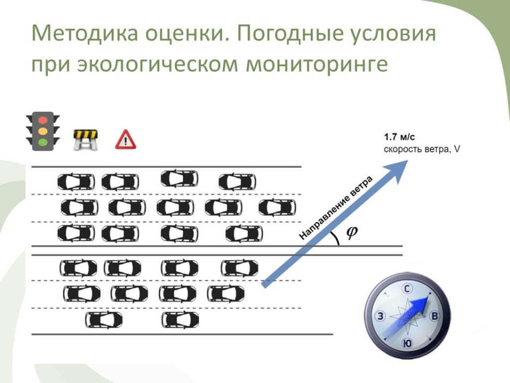 Формулы учитывают скорость движения ветра, под каким углом относительно дороги он дует и скорость движения транспортного потока (данные берутся с сервиса Яндекс. Пробки). Также учитывается средний выхлоп загрязняющих веществ по всем видам транспорта и всем типам двигателей.
