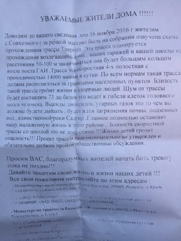 0:00 0:00:58 ЗагрузитьАктивисты в селе распространяют анонимные листовки с призывом бить тревогу. «Эта трасса планируется для прохождения возле вашего дома, ваших гаражей и вашей школы на расстоянии 50-100 метров. Заканчиваться она будет большим кольцом возле поста ГАИ. По всем нормам такая трасса должна располагаться за границами населенных пунктов. Близость такой трассы грозит жизни и здоровью людей. Шум от трассы будет составлять 73 децибелла. Выбросы диоксидов, угарных газов – это то, чем вы должны будете дышать, будет идти загрязнение почвы, подземных вод. Главное – полностью остановит нашу налаженную жизнь. Просим вас, благоразумных жителей, начать бить тревогу, пока не поздно!», – говорится в листовке, копией которой располагают Крым.Реалии.