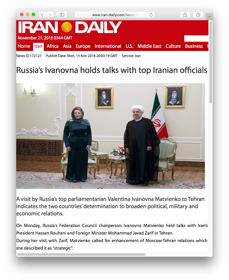 Иранская англоязычная газета Iran Daily написала о встрече председателя Совета Федерации Валентины Матвиенко с президентом Ирана Хасаном Роухани. Правда, издание не разобралось, где в строчке «Валентина Ивановна Матвиенко» имя, поэтому называло ее то «Ивановна», то «Ивановна Матвиенко».