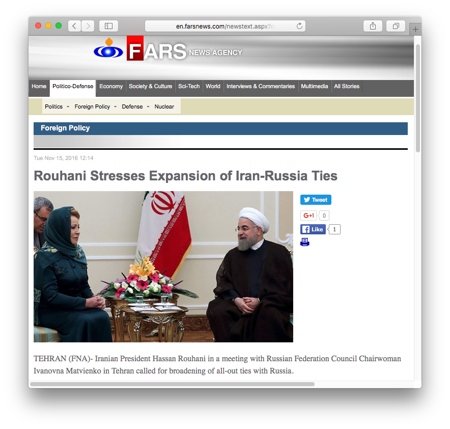 Про визит «Ивановны Матвиенко» написало и иранское информагентство Fars. А у издания Jam News есть даже соответствующий тег, по которому находится только одна новость.