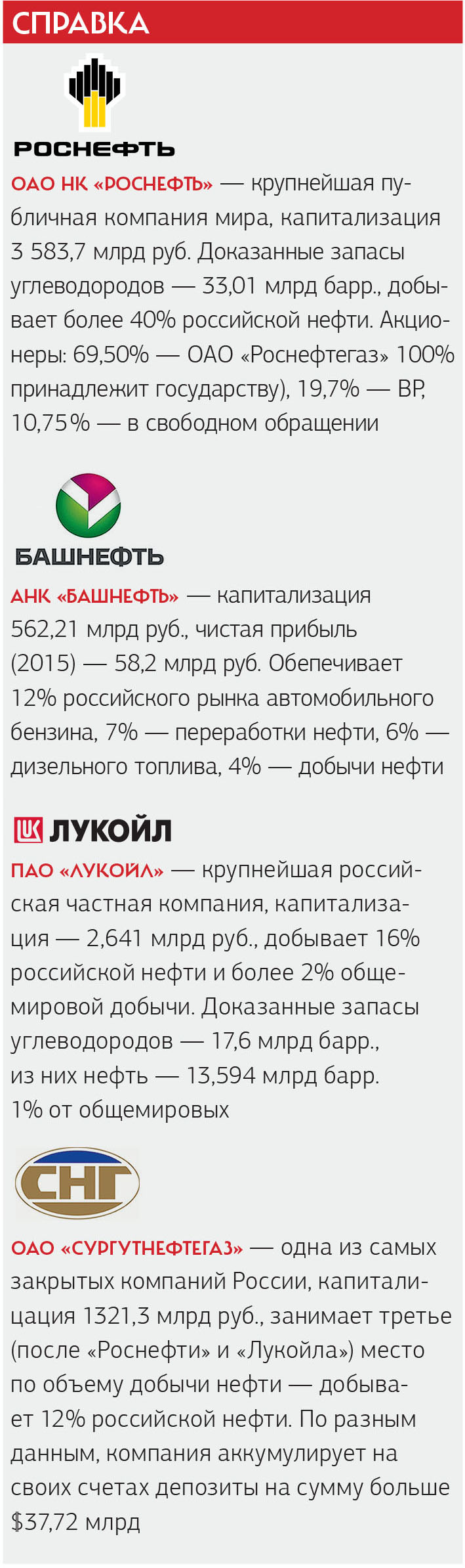 Аналитики в сентябре 2016 года были в недоумении: строго говоря, «Роснефть» совершенно не должна была интересоваться «Башнефтью», которая является скорее нефтеперерабатывающей, нежели нефтедобывающей компанией; бóльшая часть ее добывающих активов — это старые месторождения высокосернистой нефти, ее переработка тесно связана с нефтехимическими компаниями Башкирии, что, вообще говоря, не слишком хорошо для бизнеса, ибо это ограничивает возможность модернизации НПЗ, ставит «Башнефть» в зависимость от партнеров. «Башнефть» вынуждена быть одной из самых инновационных компаний России. Впрочем, у нее есть и потенциально «золотой» актив — это выигранное на конкурсе в 2011 году совместно с «Лукойлом» месторождение Требса и Титова с запасами (категория С1) не менее 210 млн тонн. Это последнее крупное нефтяное месторождение, найденное во времена СССР, в 1987 году, еще в 1997 году на него претендовал консорциум Texaco, Exxon, Amoco и Norsk Hydro (подробнее— см. «Нефть в обмен на свободу», NT № 30 от 22 сентября 2014 года). Причины, по которым «Роснефть» отказалась участвовать в разработке, неизвестны, сейчас компания Игоря Сечина рассматривает будущее сотрудничество с «Лукойлом» на месторождении с большим энтузиазмом.